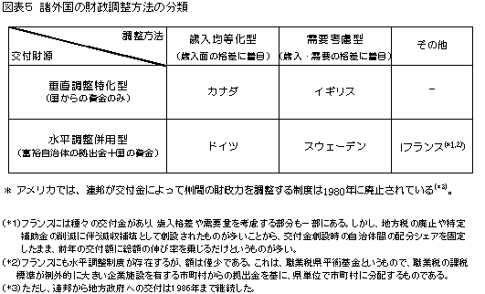 各国の財政調整制度を、交付財源から分類すると、全てを国からの資金で賄う方法(垂直調整特化型)と、一部を富裕自治体からの拠出金によって賄う方法(水平調整併用型)とがある。また、調整方法から分類すると、歳入格差のみを均等化する方法(歳入均等化型)と、需要面の格差をも考慮する方法(需要考慮型)の2つに分類できる。 | ||