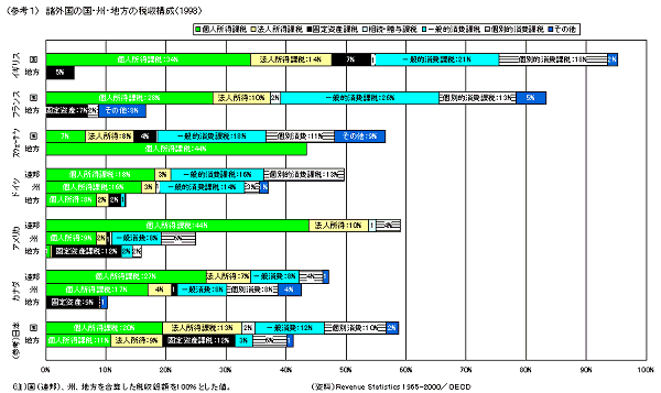 | (3 | ) 連邦制国家の州を除けば、資産課税中心の国と、個人所得課税中心の国とに二分 諸外国の地方税の構成は、大きく分けて、資産課税1)を中心としている国と、個人所得課税を中心としている国とに二分されており、また、連邦制国家の州税については、個人所得課税に加え、消費課税の比重も大きくなっている。 | |