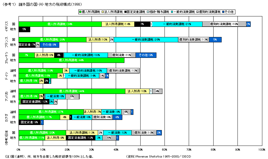 個人所得課税+消費課税中心型 ドイツ、アメリカ、カナダなど連邦制国家における州については、個人所得課税に加え、消費課税の占める比重も大きい1)。 広く売上全般に課税する一般的消費課税2)としては、多段階の売上に課税する付加価値税と、小売段階のみの売上に課税する小売売上税の2種類があるが、ドイツでは前者、アメリカでは後者が採用されている3)。 小売売上税を採用しているアメリカでは、州毎に異なる税率が適用されており、徴税も州毎に行なわれている。しかし、通信販売や電子商取引の発展に伴って、複数の州にまたがった取引への課税の困難性が、問題視されている4)。 一方、付加価値税を採用しているドイツでは、州独自の税率設定はされておらず、連邦税と併せて徴税し、州・地方へ分配する制度となっている。 一般的消費課税の地方税としての導入は、イギリスでも過去に検討されたことがある。しかし、小売売上税は、地域毎に税率が異なることで越境購買の問題を生じることから、連邦制の州のように広い面積の自治体を前提としない限り導入は困難5)として見送られ、また、付加価値税についても、地方毎に税率を設定することが困難であることから地方に税率設定権を付与できず、また、国が徴税し地方に分配する制度では、住民の地方税納税の意識が働かない点が指摘され5)、導入されていない。 | ||