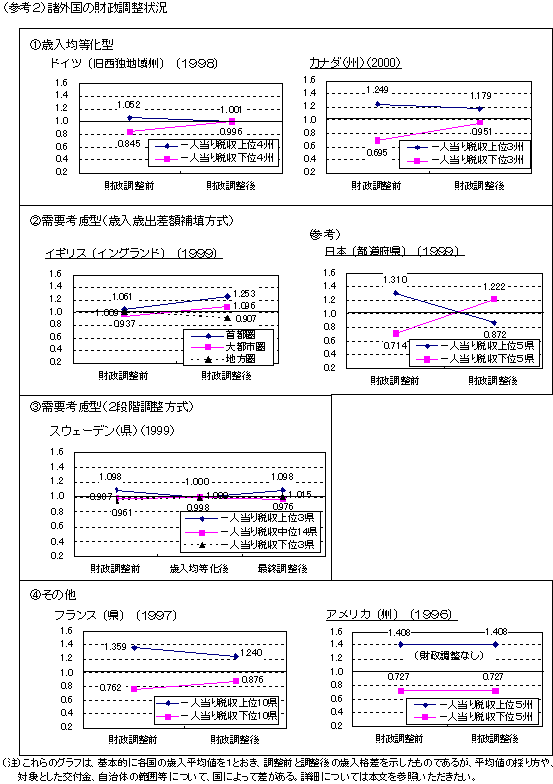 (2 | ) 財政調整の方法は、歳入均等化型の国と需要考慮型の国とが存在 諸外国における財政調整の方法は、歳入均等化型を採用しているドイツ、カナダと、需要考慮型を採用しているイギリス、スウェーデンとに2分されている。 歳入均等化型は、住民一人当りの歳入が一定水準に満たない自治体に不足額を交付する方法である。 ドイツでは、歳入が乏しい州に対し、一人当り歳入の全州平均の99.5%の水準まで交付金が支給されるが、95%までの調整は、富裕州からの拠出金を財源としている。このため、財政調整は富裕州にも影響を及ぼすこととなり、この結果、一人当りの歳入格差は、ほぼ均等化されている。 一方、カナダでは、全てが連邦資金によって調整されており、富裕州の資金の拠出はない。このため、財政調整後においても、富裕州とそれ以外の州との歳入格差は残ることとなる。カナダでの歳入均等化の水準は、制度創設当初は、歳入の上位2州平均であったが、その後、全州平均に引下げられ、現在では、財政力が極端に強い産油州アルバータと、財政力が低いとされる大西洋沿岸の4州1)を除いた中位5州2)の平均値が用いられている。 なお、カナダでは、憲法上、「連邦政府および議会は、交付金によって、州が、等しい課税水準で、等しい水準の公共サービスを提供できることを保障しなければならない」とされており、行政需要の格差を考慮しない現行制度が問題視されている3)。このため、需要を考慮するための仕組みが検討されているが、どの行政需要をどの指標を用いて算入するかを巡って州間の対立があり、実現していない。 | |