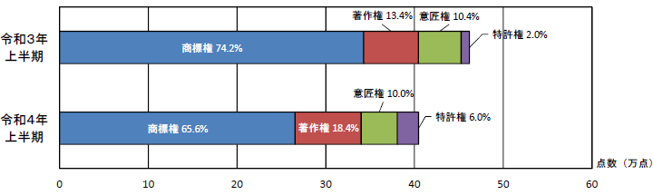 - 輸入差止点数についても、商標権侵害物品が265,412点(構成比65.6%、前年同期比22.5%減)で、全体の大半を占めており、次いで著作権侵害物品が74,527点(同18.4%、同20.7%増)でした。