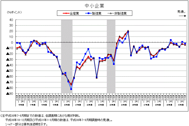 | 調査対象期間 | 判断項目: | 平成30年7〜9月期及び9月末見込み、平成30年10〜12月期及び12月末見通し、平成31年1〜3月期及び3月末見通し。 |